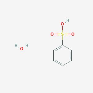 Benzenesulfonic acid (C₆H₅SO₃H) is an organosulfur compound and the simplest aromatic sulfonic acid.[1] It is often stored and used in its monohydrate form (C₆H₅SO₃H·H₂O). This compound presents as white deliquescent sheet crystals or a white waxy solid.[1] Benzenesulfonic acid is a strong acid, almost fully dissociating in aqueous solutions, which makes it a valuable catalyst and intermediate in a wide range of chemical processes.[1][2] Its applications are extensive, serving as a key ingredient in the synthesis of dyes, pharmaceuticals (where its salts are known as besylates), and surfactants used in detergents.[3][4][5]