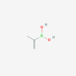 This compound is an organoboron compound featuring a vinyl group attached to the boron atom. This structural motif makes it a versatile building block for the introduction of the isopropenyl group in the construction of carbon-carbon bonds. While the free boronic acid can be challenging to handle due to its propensity for dehydration to form boroxines, it is often generated in situ or handled as its more stable pinacol ester derivative, 4,4,5,5-tetramethyl-2-(prop-1-en-2-yl)-1,3,2-dioxaborolane. This guide will cover the synthesis of the pinacol ester and its subsequent hydrolysis to the desired this compound.