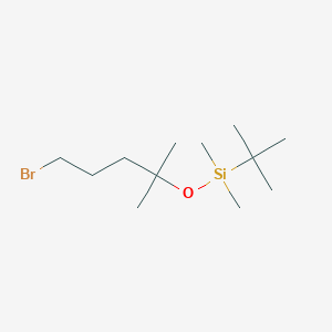 (4-Bromo-1,1-dimethyl-butoxy)-tert-butyl-dimethyl-silane (abbreviated as BDBT) is an organosilicon compound with a complex structure that includes a bromobutoxy group and a tert-butyl dimethylsilane moiety. Its molecular formula is C₁₂H₂₇BrOSi, and it has a molecular weight of approximately 300.37 g/mol. This compound has garnered attention for its potential applications in various fields, including organic synthesis and materials science. However, its biological activity remains less understood, necessitating a detailed exploration of its properties and interactions.