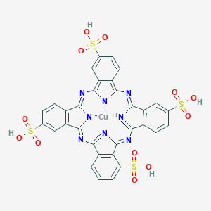 3,4',4'',4'''-Tetrasulfonyl copper phthalocyanine, tetra sodium salt (CuPcTS, Na⁴[C₃₂H₁₂CuN₈S₄O₁₂]) is a water-soluble derivative of copper phthalocyanine functionalized with four sulfonic acid groups at specific peripheral positions. The sulfonic acid substituents enhance solubility in polar solvents, making it suitable for applications in aqueous systems, such as sensors, energy storage, and nanotechnology .