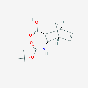 (1S,2R,3S,4R)-3-(tert-butoxycarbonylamino)bicyclo[2.2.1]hept-5-ene-2-carboxylic acid is a chiral bicyclic compound featuring a norbornene core ([2.2.1] bicyclo system) with a tert-butoxycarbonyl (Boc)-protected amino group at the 3-position and a carboxylic acid at the 2-position (Figure 1). Its molecular formula is C₁₃H₁₉NO₄ (MW = 253.29), CAS 148257-12-9, and it is primarily used as a synthetic intermediate or pharmaceutical impurity in non-medical research . The Boc group enhances stability during synthesis, while the carboxylic acid enables further functionalization.