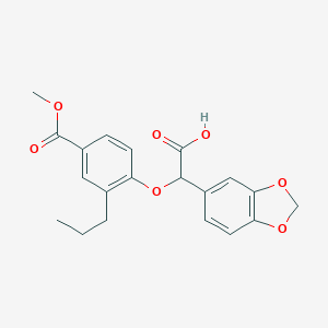 The mechanism of action of 2-(Benzo[d][1,3]dioxol-5-yl)-2-(4-(methoxycarbonyl)-2-propylphenoxy)acetic acid involves its interaction with specific molecular targets and pathways. The compound may exert its effects by binding to enzymes or receptors, modulating their activity, and influencing cellular processes. Detailed studies are required to elucidate the exact molecular targets and pathways involved.