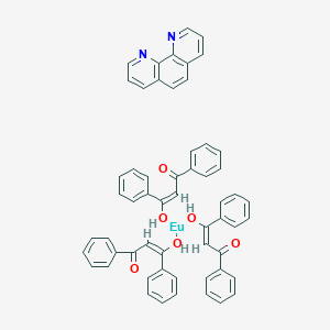 Tris(dibenzoylmethane)mono(phenanthroline)europium(III) (chemical formula: C₅₇H₄₄EuN₂O₆; molecular weight: ~1001.93 g/mol) is a ternary europium(III) β-diketonate complex. It consists of three dibenzoylmethane (DBM) ligands and one 1,10-phenanthroline (Phen) auxiliary ligand coordinated to the central Eu³⁺ ion . The DBM ligands act as sensitizers ("antenna" ligands), absorbing UV light and transferring energy to the europium ion, while the Phen ligand enhances luminescence by displacing water molecules, thereby reducing nonradiative decay pathways .