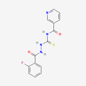 N-[[(2-Fluorobenzoyl)amino]carbamothioyl]pyridine-3-carboxamide is a thiosemicarbazide derivative characterized by a pyridine-3-carboxamide core modified with a 2-fluorobenzoyl-substituted carbamothioyl group. Its structure combines a fluorinated aromatic ring (enhancing lipophilicity and metabolic stability) with a thiosemicarbazide moiety (imparting metal-chelating capabilities).
