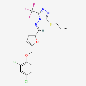 “N-((E)-1-{5-[(2,4-DICHLOROPHENOXY)METHYL]-2-FURYL}METHYLIDENE)-N-[3-(PROPYLSULFANYL)-5-(TRIFLUOROMETHYL)-4H-1,2,4-TRIAZOL-4-YL]AMINE” is a complex organic compound that features a combination of furan, triazole, and phenoxy groups