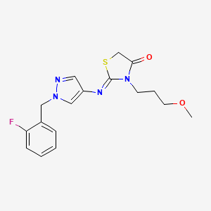 2-{[1-(2-FLUOROBENZYL)-1H-PYRAZOL-4-YL]IMINO}-3-(3-METHOXYPROPYL)-1,3-THIAZOLAN-4-ONE is a synthetic organic compound that features a unique combination of functional groups, including a fluorobenzyl group, a pyrazole ring, an imino group, a methoxypropyl chain, and a thiazolanone core. This compound is of interest in various fields of research due to its potential biological activities and its role as an intermediate in the synthesis of more complex molecules.