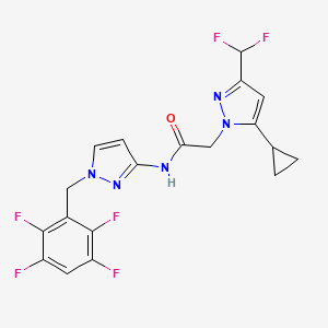 2-[5-cyclopropyl-3-(difluoromethyl)-1H-pyrazol-1-yl]-N-[1-(2,3,5,6-tetrafluorobenzyl)-1H-pyrazol-3-yl]acetamide is a complex organic compound that has garnered interest in various scientific fields due to its unique chemical structure and potential applications. This compound features a combination of cyclopropyl, difluoromethyl, and tetrafluorobenzyl groups attached to a pyrazole ring, making it a subject of study for its chemical reactivity and potential biological activities.