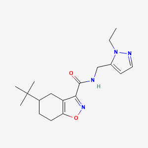 5-(TERT-BUTYL)-N-[(1-ETHYL-1H-PYRAZOL-5-YL)METHYL]-4,5,6,7-TETRAHYDRO-1,2-BENZISOXAZOLE-3-CARBOXAMIDE: is a complex organic compound that has garnered interest in various fields of scientific research. This compound is characterized by its unique structure, which includes a tert-butyl group, a pyrazole ring, and a benzisoxazole moiety. Its multifaceted structure allows it to participate in a variety of chemical reactions, making it a valuable subject of study in organic chemistry and related disciplines.