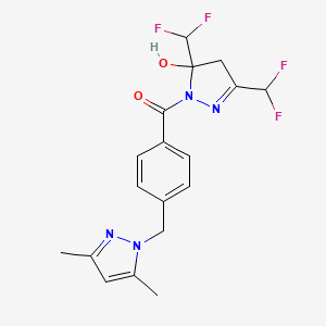 The synthesis of [3,5-bis(difluoromethyl)-5-hydroxy-4,5-dihydro-1H-pyrazol-1-yl]{4-[(3,5-dimethyl-1H-pyrazol-1-yl)methyl]phenyl}methanone typically involves multi-step organic reactions. The process begins with the preparation of the pyrazole rings, followed by the introduction of difluoromethyl groups and the final coupling of the pyrazole units. Common reagents used in these reactions include hydrazines, aldehydes, and fluorinating agents. The reaction conditions often require controlled temperatures and the use of catalysts to ensure high yields and purity.