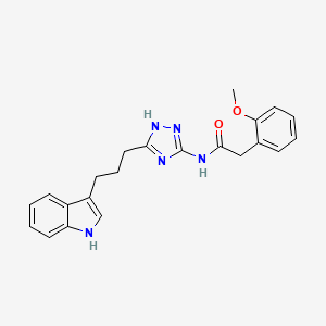 The synthesis of N-{3-[3-(1H-indol-3-yl)propyl]-1H-1,2,4-triazol-5-yl}-2-(2-methoxyphenyl)acetamide typically involves multiple steps, starting with the preparation of the indole derivative, followed by the formation of the triazole ring, and finally the coupling with the methoxyphenyl acetamide group. Common reagents used in these reactions include indole, triazole precursors, and methoxyphenyl acetic acid derivatives. The reactions are often carried out under controlled conditions such as specific temperatures, solvents, and catalysts to ensure high yield and purity .