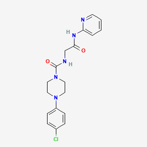 The mechanism of action of 4-(4-chlorophenyl)-N-[2-oxo-2-(pyridin-2-ylamino)ethyl]piperazine-1-carboxamide involves its interaction with specific molecular targets. The compound may bind to enzymes or receptors, inhibiting their activity or modulating their function. The exact pathways and targets would depend on the specific biological context and the structure-activity relationship studies conducted.