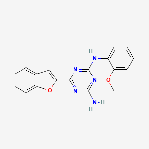 6-(1-Benzofuran-2-yl)-N-(2-methoxyphenyl)-1,3,5-triazine-2,4-diamine is a triazine derivative featuring a benzofuran moiety at the 6-position and a 2-methoxyphenyl substituent at the N2-position. The compound belongs to the 1,3,5-triazine-2,4-diamine class, which is widely studied for its diverse biological activities, including antiproliferative, antimicrobial, and herbicidal properties . The benzofuran group enhances π-π stacking interactions in biological systems, while the methoxy substituent on the phenyl ring modulates electronic effects and solubility .