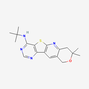 The synthesis of N-tert-butyl-5,5-dimethyl-6-oxa-17-thia-2,12,14-triazatetracyclo[8.7.0.03,8.011,16]heptadeca-1,3(8),9,11,13,15-hexaen-15-amine involves multiple steps, starting from readily available precursors. The key steps include cyclization reactions, introduction of tert-butyl groups, and formation of the tetracyclic core. Specific reaction conditions, such as temperature, solvents, and catalysts, are crucial for achieving high yields and purity .
