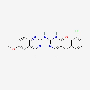 The compound 5-(3-chlorobenzyl)-2-[(6-methoxy-4-methylquinazolin-2-yl)amino]-6-methylpyrimidin-4(3H)-one features a pyrimidin-4(3H)-one core substituted with a 3-chlorobenzyl group at position 5, a methyl group at position 6, and a 6-methoxy-4-methylquinazolin-2-ylamino moiety at position 2. This structure combines heterocyclic motifs (pyrimidinone and quinazoline) with halogenated and alkyl/aryl substituents, which are common in pharmacologically active molecules targeting enzymes or receptors.