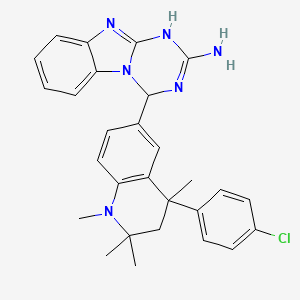 Similar compounds include other derivatives of [1,3,5]triazino[1,2-a]benzimidazole, such as 4,4-dialkyl-3,4-dihydro[1,3,5]triazino[1,2-a]benzimidazol-2-amines . These compounds share similar structural features and biological activities but differ in their specific substituents and functional groups. The uniqueness of 4-[4-(4-Chlorophenyl)-1,2,2,4-tetramethyl-1,2,3,4-tetrahydroquinolin-6-yl]-1,4-dihydro[1,3,5]triazino[1,2-a]benzimidazol-2-amine lies in its specific combination of a chlorophenyl group and a tetrahydroquinoline ring, which may confer distinct biological properties .