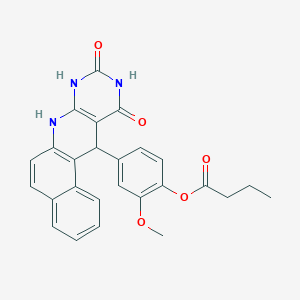 The synthesis of 4-(9,11-Dioxo-7,8,9,10,11,12-hexahydrobenzo[F]pyrimido[4,5-B]quinolin-12-YL)-2-methoxyphenyl butyrate involves multiple steps, including the formation of the core structure and subsequent functionalization. The core structure can be synthesized through a series of condensation reactions involving appropriate starting materials such as quinoline derivatives and aromatic aldehydes. The reaction conditions typically involve the use of solvents like ethanol or methanol and catalysts such as p-toluenesulfonic acid.