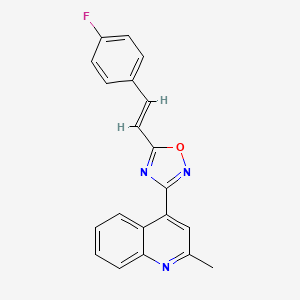5-[(E)-2-(4-Fluorophenyl)-1-ethenyl]-3-(2-methyl-4-quinolyl)-1,2,4-oxadiazole is a synthetic organic compound that belongs to the class of oxadiazoles. This compound is characterized by its unique structure, which includes a fluorophenyl group, an ethenyl linkage, and a quinolyl moiety. It has garnered interest in various fields of scientific research due to its potential biological and chemical properties.