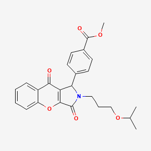 The synthesis of methyl 4-{3,9-dioxo-2-[3-(propan-2-yloxy)propyl]-1H,2H,3H,9H-chromeno[2,3-c]pyrrol-1-yl}benzoate typically involves multi-step organic reactions. The synthetic route often starts with the preparation of the chromeno[2,3-c]pyrrole core, followed by the introduction of the benzoate and propan-2-yloxypropyl groups. Common reagents used in these reactions include various acids, bases, and solvents to facilitate the formation of the desired product. Industrial production methods may involve optimizing these reactions for higher yields and purity, often using advanced techniques such as chromatography for purification.