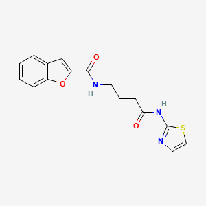 N-[4-oxo-4-(1,3-thiazol-2-ylamino)butyl]-1-benzofuran-2-carboxamide is a synthetic compound featuring a benzofuran carboxamide core linked via a 4-oxobutyl chain to a 1,3-thiazol-2-ylamino moiety. Benzofuran and thiazole rings are well-known pharmacophores, often associated with diverse biological activities, including antimicrobial, anticancer, and enzyme inhibitory properties .