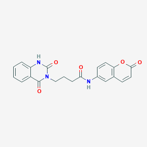 4-(2,4-Dioxo-1,4-dihydroquinazolin-3(2H)-yl)-N-(2-oxo-2H-chromen-6-yl)butanamide is a hybrid heterocyclic compound combining a quinazolinone core and a coumarin moiety. The quinazolinone scaffold (2,4-dioxo-1,4-dihydroquinazolin-3(2H)-yl) is known for its diverse pharmacological activities, including anticonvulsant, anticancer, and enzyme-modulating properties .