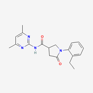 The synthesis of N-(4,6-dimethylpyrimidin-2-yl)-1-(2-ethylphenyl)-5-oxopyrrolidine-3-carboxamide typically involves multi-step organic reactions. The process begins with the preparation of the pyrimidine ring, followed by the introduction of the ethylphenyl group and the formation of the pyrrolidine ring. Specific reaction conditions, such as temperature, pressure, and the use of catalysts, are crucial to ensure the desired product is obtained with high yield and purity.