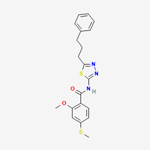 The synthesis of 2-methoxy-4-(methylsulfanyl)-N-[5-(3-phenylpropyl)-1,3,4-thiadiazol-2-yl]benzamide typically involves multiple steps. One common method includes the reaction of 2-methoxy-4-(methylsulfanyl)benzoic acid with thionyl chloride to form the corresponding acid chloride. This intermediate is then reacted with 5-(3-phenylpropyl)-1,3,4-thiadiazol-2-amine under basic conditions to yield the final product.