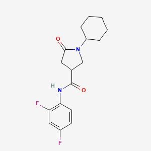 1-cyclohexyl-N-(2,4-difluorophenyl)-5-oxopyrrolidine-3-carboxamide is a synthetic organic compound with potential applications in various fields of scientific research. Its structure consists of a cyclohexyl group, a difluorophenyl group, and a pyrrolidine ring with a carboxamide functional group.