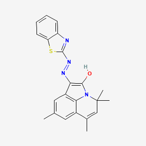 The synthesis of (1Z)-1-[2-(1,3-benzothiazol-2-yl)hydrazinylidene]-4,4,6,8-tetramethyl-4H-pyrrolo[3,2,1-ij]quinolin-2(1H)-one typically involves multiple steps, starting from commercially available precursors. One common synthetic route includes the condensation of 1,3-benzothiazole-2-amine with a suitable hydrazine derivative, followed by cyclization and functional group modifications to introduce the pyrroloquinoline core and the tetramethyl groups. The reaction conditions often require the use of strong acids or bases, elevated temperatures, and inert atmospheres to ensure the desired product is obtained with high purity and yield .