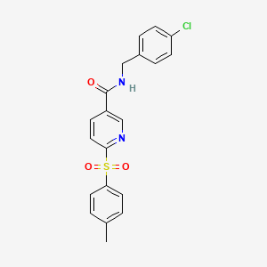 N-[(4-CHLOROPHENYL)METHYL]-6-(4-METHYLBENZENESULFONYL)PYRIDINE-3-CARBOXAMIDE is a complex organic compound with significant potential in various scientific fields. This compound features a pyridine ring substituted with a carboxamide group, a chlorophenylmethyl group, and a methylbenzenesulfonyl group. Its unique structure allows it to participate in a variety of chemical reactions and makes it a valuable subject of study in medicinal chemistry and industrial applications.