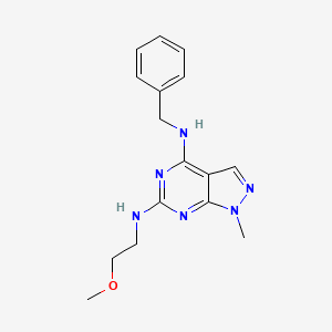 N4-benzyl-N6-(2-methoxyethyl)-1-methyl-1H-pyrazolo[3,4-d]pyrimidine-4,6-diamine is a complex organic compound belonging to the class of pyrazolo[3,4-d]pyrimidines. These compounds are known for their diverse biological activities and potential therapeutic applications. The structure of this compound includes a pyrazolo[3,4-d]pyrimidine core, which is a bicyclic system combining a pyrazole ring and a pyrimidine ring. The presence of benzyl and methoxyethyl groups further enhances its chemical properties and potential biological activities.