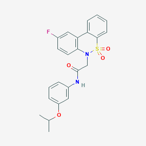 2-(9-fluoro-5,5-dioxido-6H-dibenzo[c,e][1,2]thiazin-6-yl)-N-(3-isopropoxyphenyl)acetamide is a complex organic compound with potential applications in various scientific fields. This compound is characterized by its unique molecular structure, which includes a fluorine atom, a dibenzo[c,e][1,2]thiazin ring, and an isopropoxyphenyl group. The presence of these functional groups contributes to its distinct chemical properties and reactivity.