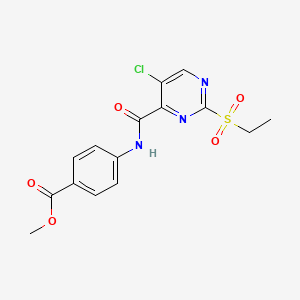 The mechanism of action of Methyl 4-({[5-chloro-2-(ethylsulfonyl)pyrimidin-4-yl]carbonyl}amino)benzoate involves its interaction with specific molecular targets. The chloro and ethylsulfonyl groups can participate in binding interactions with enzymes or receptors, potentially inhibiting their activity. The pyrimidine ring may also play a role in stabilizing these interactions through hydrogen bonding or π-π stacking.