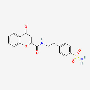 The molecular formula of 4-oxo-N-[2-(4-sulfamoylphenyl)ethyl]-4H-chromene-2-carboxamide is C₁₈H₁₆N₂O₅S , with a molecular weight of 396.4 g/mol . The core structure consists of a 4H-chromen-4-one scaffold substituted at the 2-position by a carboxamide group, which is further linked to a 4-sulfamoylphenethyl moiety. The IUPAC name, 4-oxo-N-[2-(4-sulfamoylphenyl)ethyl]chromene-2-carboxamide, reflects this connectivity.