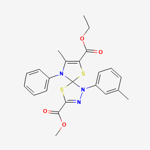 7-Ethyl 3-methyl 8-methyl-1-(3-methylphenyl)-9-phenyl-4,6-dithia-1,2,9-triazaspiro[4.4]nona-2,7-diene-3,7-dicarboxylate is a complex organic compound with a unique spiro structure. This compound is characterized by its multiple functional groups, including ethyl, methyl, phenyl, and dithia-triazaspiro moieties. The presence of these diverse functional groups makes it a compound of interest in various fields of scientific research.
