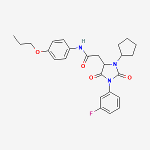 2-[3-cyclopentyl-1-(3-fluorophenyl)-2,5-dioxoimidazolidin-4-yl]-N-(4-propoxyphenyl)acetamide is a complex organic compound with potential applications in various scientific fields. This compound features a unique structure that includes a cyclopentyl group, a fluorophenyl group, and an imidazolidinone core, making it a subject of interest for researchers in chemistry, biology, and medicine.