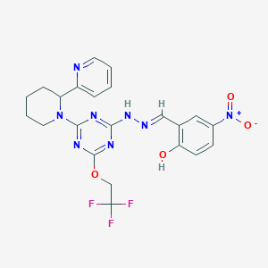 4-NITRO-2-[(E)-(2-{4-[2-(PYRIDIN-2-YL)PIPERIDIN-1-YL]-6-(2,2,2-TRIFLUOROETHOXY)-1,3,5-TRIAZIN-2-YL}HYDRAZIN-1-YLIDENE)METHYL]PHENOL is a complex organic compound with a multifaceted structure. It contains various functional groups, including nitro, pyridine, piperidine, triazine, and phenol, making it a versatile molecule in chemical research and industrial applications.