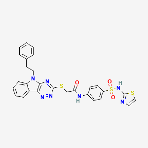 2-{[5-(2-Phenylethyl)-5H-[1,2,4]triazino[5,6-b]indol-3-yl]sulfanyl}-N-{4-[(1,3-thiazol-2-yl)sulfamoyl]phenyl}acetamide is a complex heterocyclic compound. It features a triazinoindole core, which is known for its diverse biological activities, including antiviral, anti-inflammatory, and anticancer properties . The compound’s structure includes a phenylethyl group, a thiazole ring, and a sulfamoyl group, contributing to its unique chemical and biological properties.