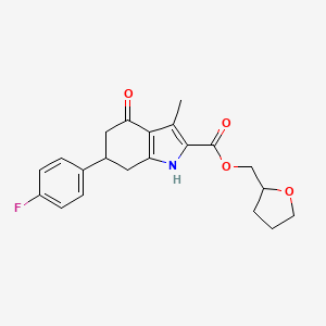 (OXOLAN-2-YL)METHYL 6-(4-FLUOROPHENYL)-3-METHYL-4-OXO-4,5,6,7-TETRAHYDRO-1H-INDOLE-2-CARBOXYLATE is a complex organic compound with potential applications in various fields such as medicinal chemistry, pharmaceuticals, and material science. This compound features a unique structure that includes an oxolane ring, a fluorophenyl group, and a tetrahydroindole core, making it an interesting subject for scientific research.