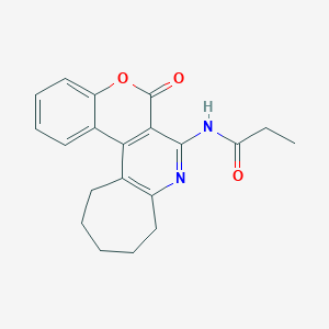 The synthesis of N-(6-oxo-6,9,10,11,12,13-hexahydrochromeno[4,3-d]cyclohepta[b]pyridin-7-yl)propanamide typically involves multiple steps, starting from simpler precursors. One common method involves the cyclization of a suitable precursor to form the chromeno-cyclohepta-pyridine core, followed by functionalization to introduce the propanamide group. Reaction conditions often include the use of catalysts, solvents, and controlled temperatures to ensure the desired product is obtained with high yield and purity.