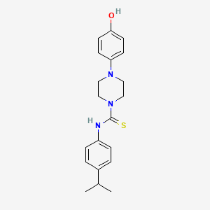 The synthesis of 4-(4-hydroxyphenyl)-N-[4-(propan-2-yl)phenyl]piperazine-1-carbothioamide typically involves multiple steps, starting with the preparation of the piperazine ring and subsequent functionalization with hydroxyphenyl and isopropylphenyl groups. Common reagents used in these reactions include piperazine, 4-hydroxybenzaldehyde, and isopropylbenzene. The reaction conditions often involve the use of solvents such as ethanol or methanol and catalysts like palladium on carbon.