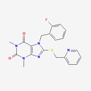 7-[(2-FLUOROPHENYL)METHYL]-1,3-DIMETHYL-8-{[(PYRIDIN-2-YL)METHYL]SULFANYL}-2,3,6,7-TETRAHYDRO-1H-PURINE-2,6-DIONE is a complex organic compound with potential applications in various fields such as chemistry, biology, and medicine. This compound is characterized by its unique structure, which includes a purine core substituted with fluorophenyl, pyridinyl, and methylsulfanyl groups.