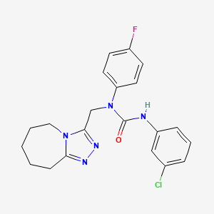 The mechanism of action of 3-(3-chlorophenyl)-1-(4-fluorophenyl)-1-(6,7,8,9-tetrahydro-5H-[1,2,4]triazolo[4,3-a]azepin-3-ylmethyl)urea involves its interaction with specific molecular targets and pathways. The compound is known to bind to certain enzymes and receptors, modulating their activity and leading to various biological effects. The exact pathways involved depend on the specific application and the biological system being studied.