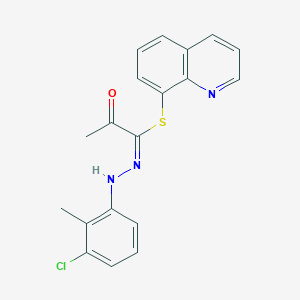 The compound (1E)-1-[2-(3-CHLORO-2-METHYLPHENYL)HYDRAZIN-1-YLIDENE]-1-(QUINOLIN-8-YLSULFANYL)PROPAN-2-ONE is a complex organic molecule that features a quinoline ring, a hydrazone linkage, and a chlorinated aromatic ring