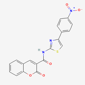N-[4-(4-nitrophenyl)-1,3-thiazol-2-yl]-2-oxo-2H-chromene-3-carboxamide is a complex organic compound that features a unique combination of functional groups, including a nitrophenyl group, a thiazole ring, and a chromene moiety. This compound is of significant interest in the fields of medicinal chemistry and materials science due to its potential biological activities and diverse chemical reactivity.