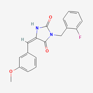 The synthesis of (5E)-3-(2-fluorobenzyl)-5-(3-methoxybenzylidene)imidazolidine-2,4-dione typically involves the condensation of 2-fluorobenzylamine with 3-methoxybenzaldehyde in the presence of a suitable catalyst. The reaction is followed by cyclization with a dione precursor under controlled conditions. The reaction conditions may include specific temperatures, solvents, and catalysts to optimize yield and purity.