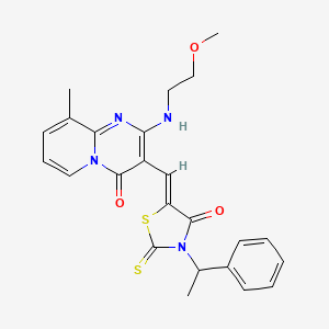 The compound 2-[(2-methoxyethyl)amino]-9-methyl-3-{(Z)-[4-oxo-3-(1-phenylethyl)-2-thioxo-1,3-thiazolidin-5-ylidene]methyl}-4H-pyrido[1,2-a]pyrimidin-4-one is a complex organic molecule that has garnered attention in medicinal chemistry due to its intricate structure and potential biological activities. This compound features a pyrido[1,2-a]pyrimidin-4-one core and a thiazolidinone moiety, which may contribute to its pharmacological properties.