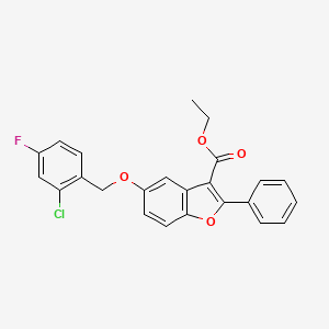 Ethyl 5-[(2-chloro-4-fluorophenyl)methoxy]-2-phenyl-1-benzofuran-3-carboxylate is a synthetic organic compound that belongs to the class of benzofuran derivatives. This compound is characterized by its unique structure, which includes a benzofuran core substituted with various functional groups, making it a subject of interest in various fields of scientific research.