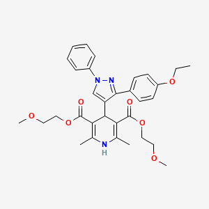 Bis(2-methoxyethyl) 4-[3-(4-ethoxyphenyl)-1-phenyl-1H-pyrazol-4-YL]-2,6-dimethyl-1,4-dihydro-3,5-pyridinedicarboxylate is a structurally complex molecule belonging to the 1,4-dihydropyridine (1,4-DHP) class. This compound features a central 1,4-dihydropyridine ring substituted at the 2- and 6-positions with methyl groups and at the 4-position with a pyrazole moiety. The pyrazole ring is further substituted with a phenyl group at position 1 and a 4-ethoxyphenyl group at position 2. The 3,5-dicarboxylate groups are esterified with 2-methoxyethyl groups, distinguishing it from related analogs .