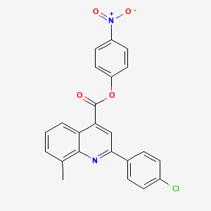 The mechanism of action of 4-Nitrophenyl 2-(4-chlorophenyl)-8-methylquinoline-4-carboxylate involves its interaction with specific molecular targets. The nitrophenyl group can act as an electron-withdrawing group, enhancing the compound’s ability to interact with nucleophilic sites on enzymes and receptors. The quinoline core can intercalate with DNA, disrupting its function and leading to cell death in cancer cells .