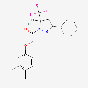 1-[3-cyclohexyl-5-hydroxy-5-(trifluoromethyl)-4,5-dihydro-1H-pyrazol-1-yl]-2-(3,4-dimethylphenoxy)ethanone is a synthetic organic compound characterized by its complex structure, which includes a cyclohexyl group, a trifluoromethyl group, and a pyrazole ring